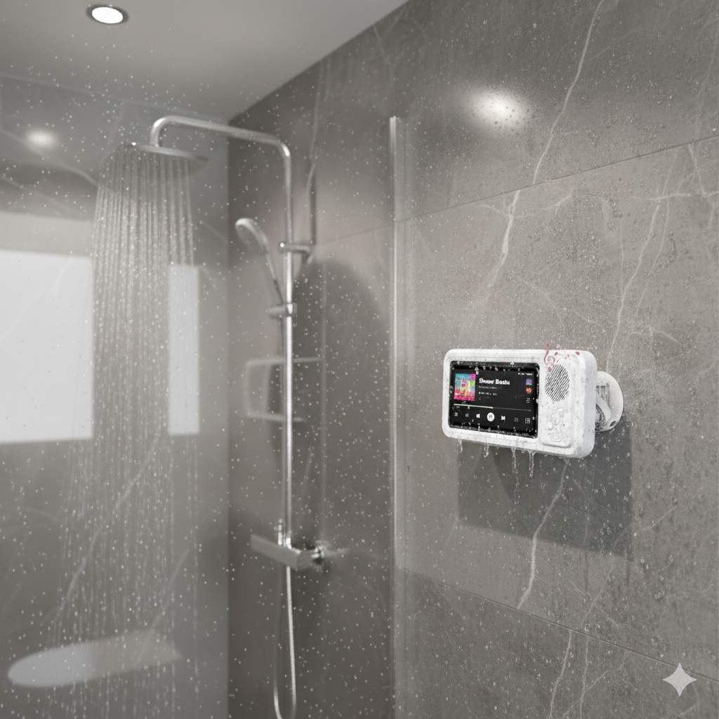 Valeria's waterproof shower case with built in Bluetooth Speaker